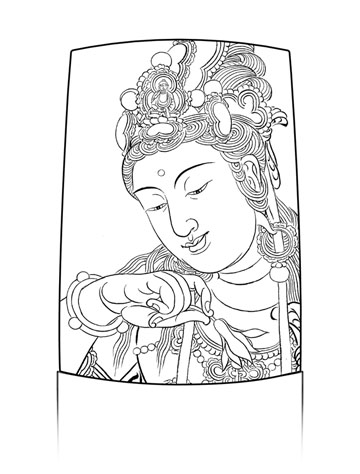 局部的觀音面容、童子與佛手,沈穩自在的線條,順著直式燈板往下延伸出流暢的視覺感,簡單而純粹的深葛色燈座,底部配有無段式亮度調節裝置,可自由調整亮度,創造不同的空間氛圍。