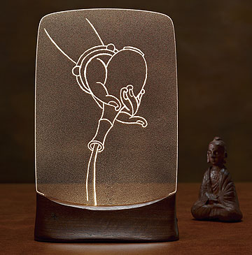 以雷射雕刻將奚淞的筆墨白描再現為一份明淨的力量。〔解縛〕以「說法印」佛手,象徵以智慧解開心結的手勢,為解開生活大小煩惱祝